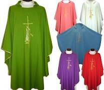 As casulas dos curas teñen diferente cor segundo no tempo litúrxico en que nos encontremos. Así, como se ve nos debuxos hai unha para cada un dos tempos litúrxicos: